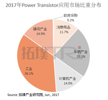 根據(jù)拓墣產(chǎn)業(yè)研究院調(diào)查顯示,在各國政府致力於節(jié)能減碳政策的推動之下,促使汽車工業(yè)與ICT科技進(jìn)一步結(jié)合,預(yù)計將帶動與車輛能源管理相關(guān)的模擬IC與分離式功率器件(Power Transistor)在單一車輛的搭載金額,由2016年的188美元上升到2017年的209美元,車輛產(chǎn)業(yè)占Power Transistor需求比重達(dá)23%,僅次於工業(yè)用需求。